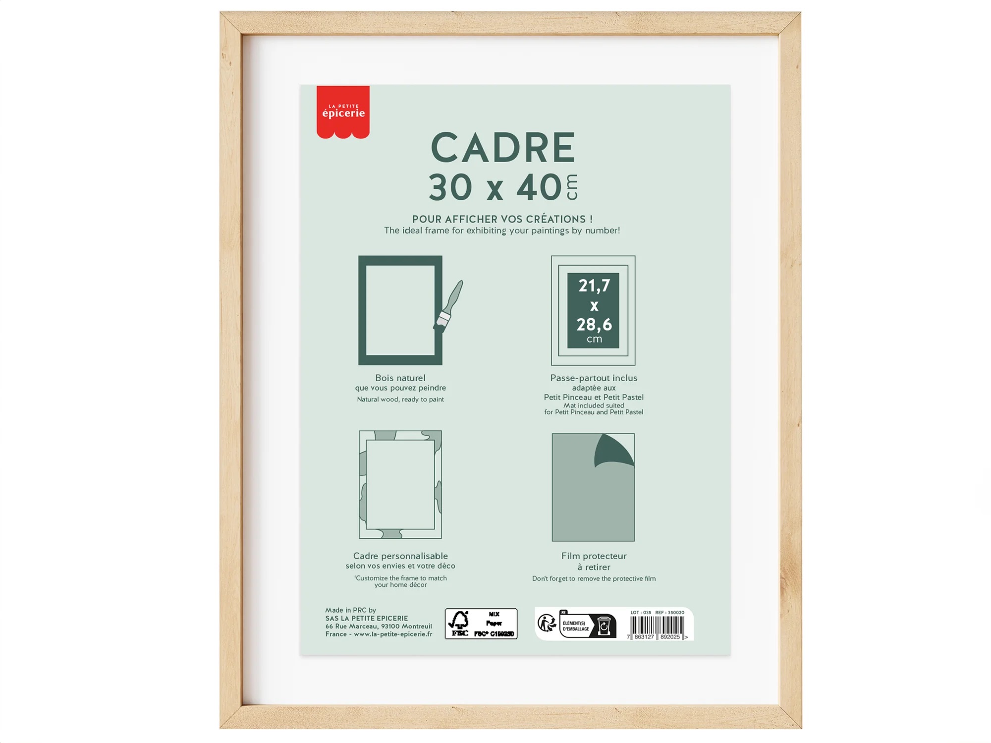 cadre naturel en bois 30 x 40 cm qui s'intègrera à toutes les décorations dans votre maison. Ce cadre est parfait pour y glisser votre peinture au numéro une fois terminée !