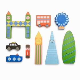 Adorable mini-ville en bois avec des bâtiments et monuments emblématiques.