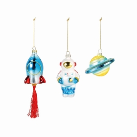 Une fusée, un astronaute et une planète : placez-les dans l'arbre de Noël! Dans une boîte cadeau. Matériau : verre Couleur : multicolore Dimensions : 6,5 x 11 | 5 x 16 | 5,5 x 8,5 cm
