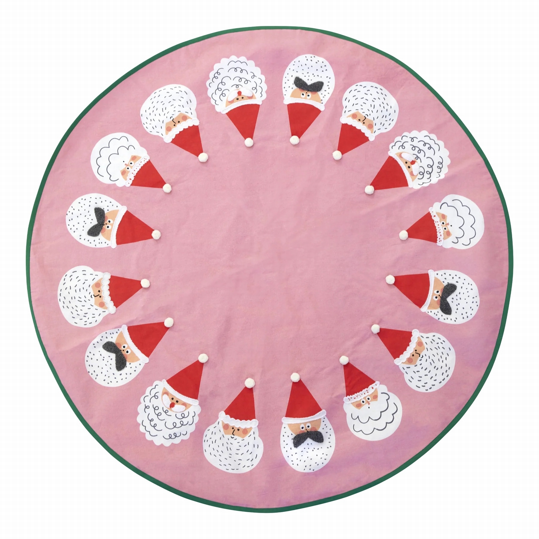 Rajoutez un peu de magie au pied du sapin avec cet adorable tapis rose et sa ronde de petits pères Noël, lisière vert sapin. Un accessoire dans le pur esprit de Noël !