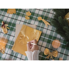 Contient : 12 feuilles de métal, 25 motifs d'ornements à créer, 1 outil à repousser à double pointe, 1 planche de feutrine, 1 rouleau de ruban adhésif, 1 bobine de ficelle dorée