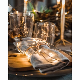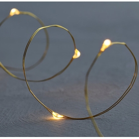 Guirlande légère dotée de 40 très petites lampes à DEL fines (0,5 cm). La guirlande est faite avec un joli et simple fil d'or, très décorative. La guirlande mesure 3,9 mètres de long et bénéficie d'une lumière naturelle chaude.