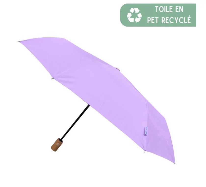 Ce parapluie écologique à ouverture et fermeture automatique a une couleur de tendance lilas : une toile 100% en tissu PET recyclé, une poignée en bois d’érable, c’est un parapluie respectueux de l’environnement.